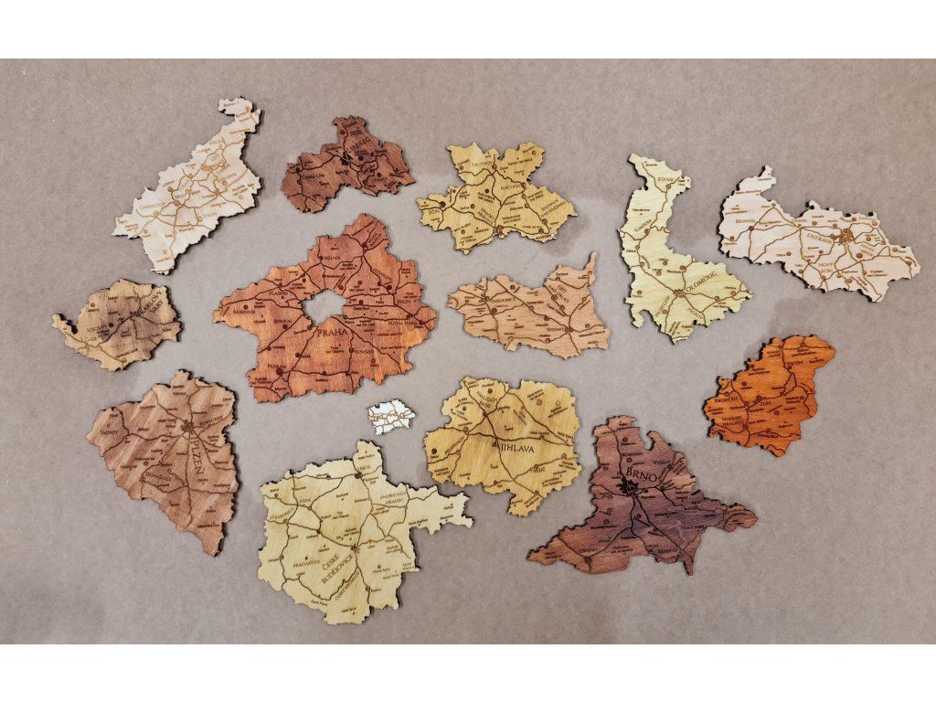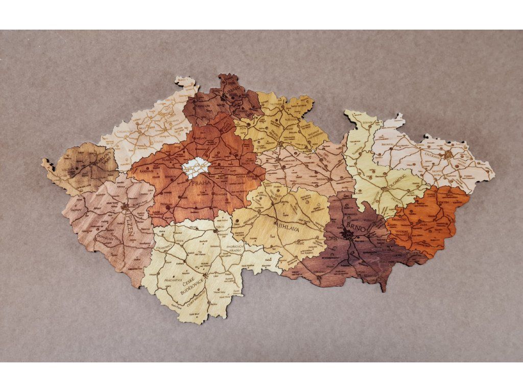 Naše dřevěná mapa ČR je něco mezi puzzle a obrazem. Celá je vyřezaná z překližky po jednotlivých krajích a ručně mořena do různých barev. Každá mapa je originál protože kraje moříme zcela náhodně. V mapě je gravura hlavních dopravních tahů a větších měst. Pro připevnění na stěnu je přibalena kvalitní oboustranná páska. A tak ti nebude chybět nic,co by bránilo tomu aby se tahle mapa stala ozdobou jakéhokoliv pokoje.