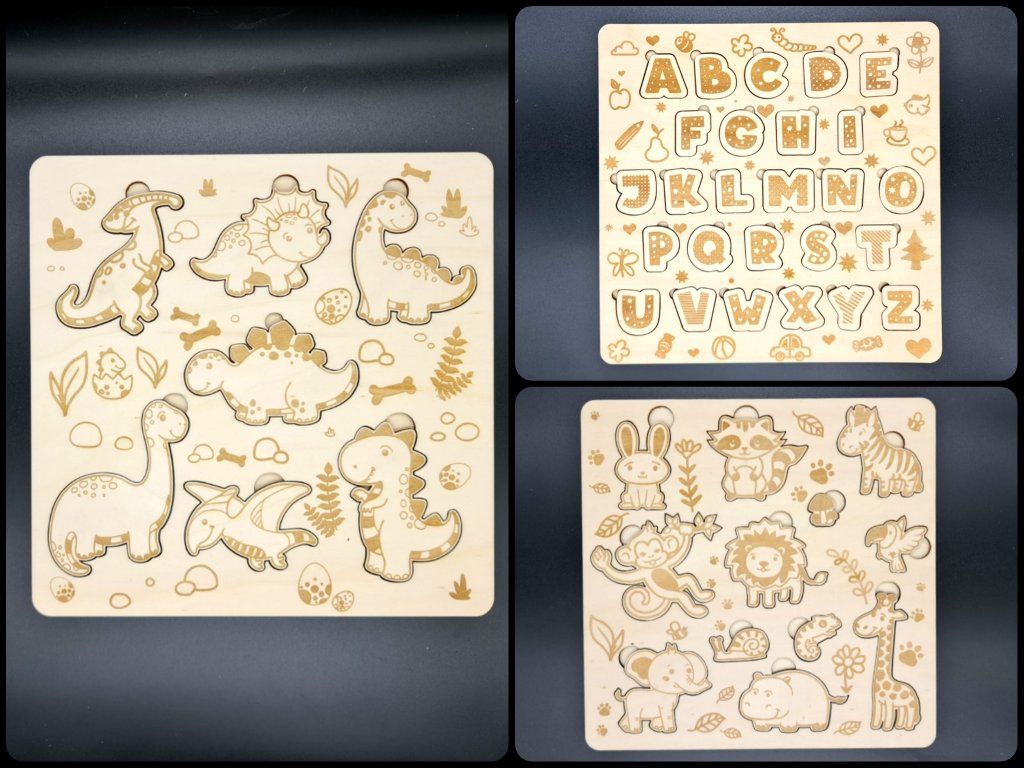 Dřevěné vkládačky jsou výborné edukativní pomůcky, pomáhají rozvíjet motoriku u dětí a je to pro ně prostě zábava. Nechej prcky ať se baví se zvířátky, dinosaury nebo ty větší s jednoduchou abecedou. Vyrábíme je z topolové překližky a obrázky na nich jsou vygravírovány. Nejsou nijak ošetřeny a tak je možné si zvířátka klidně vybarvit. To už záleží na tobě.