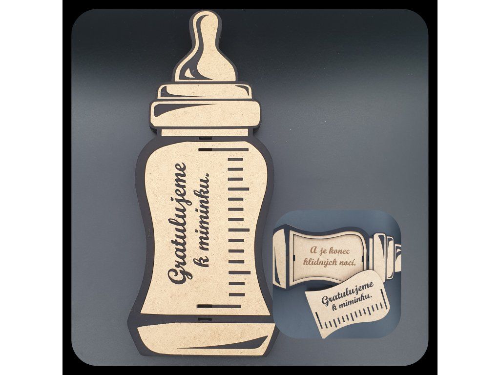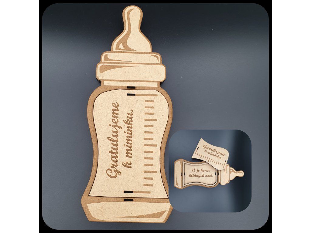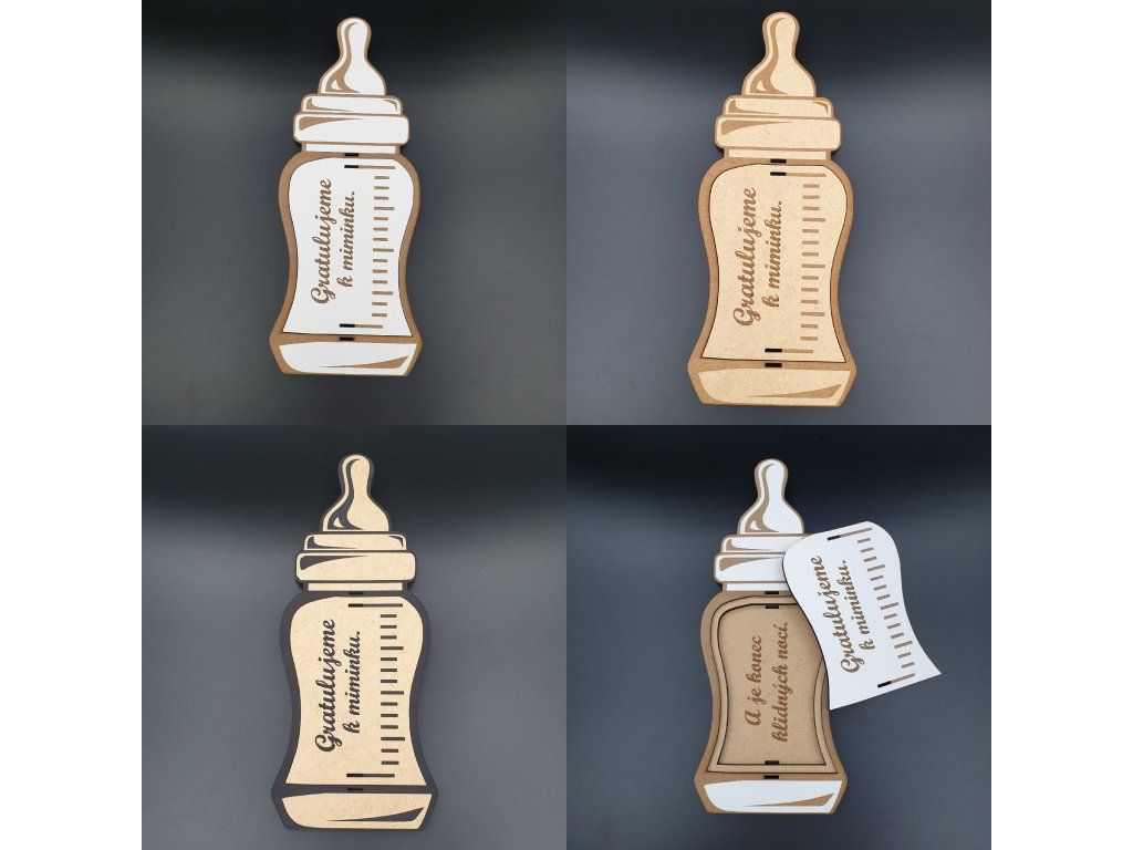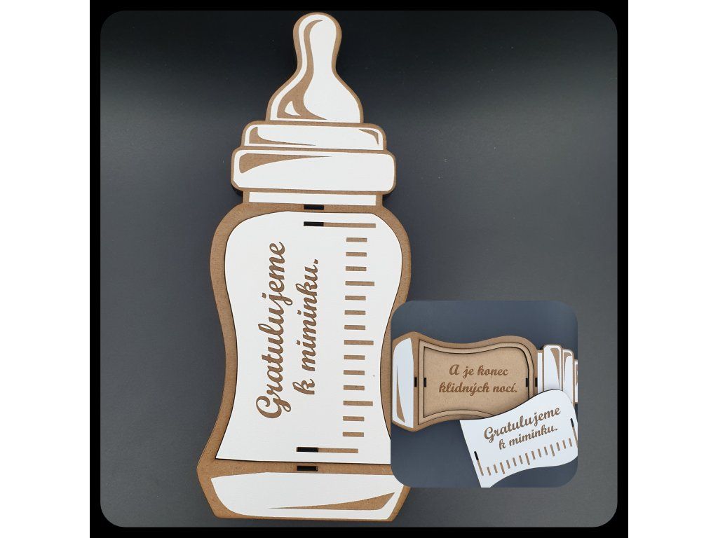 Láhev s dudlíkem, která vypadá jako skutečná kojenecká láhev? Ano, prosím! Vyřezaná z kvalitní MDF vrstvené desky, tato krabička je stejně stylová jako praktická. Vyberte si z elegantních barev – bílá, přírodní nebo černé detaily. Chcete něco extra? Jdeme na růžové nebo modré detaily na přání!