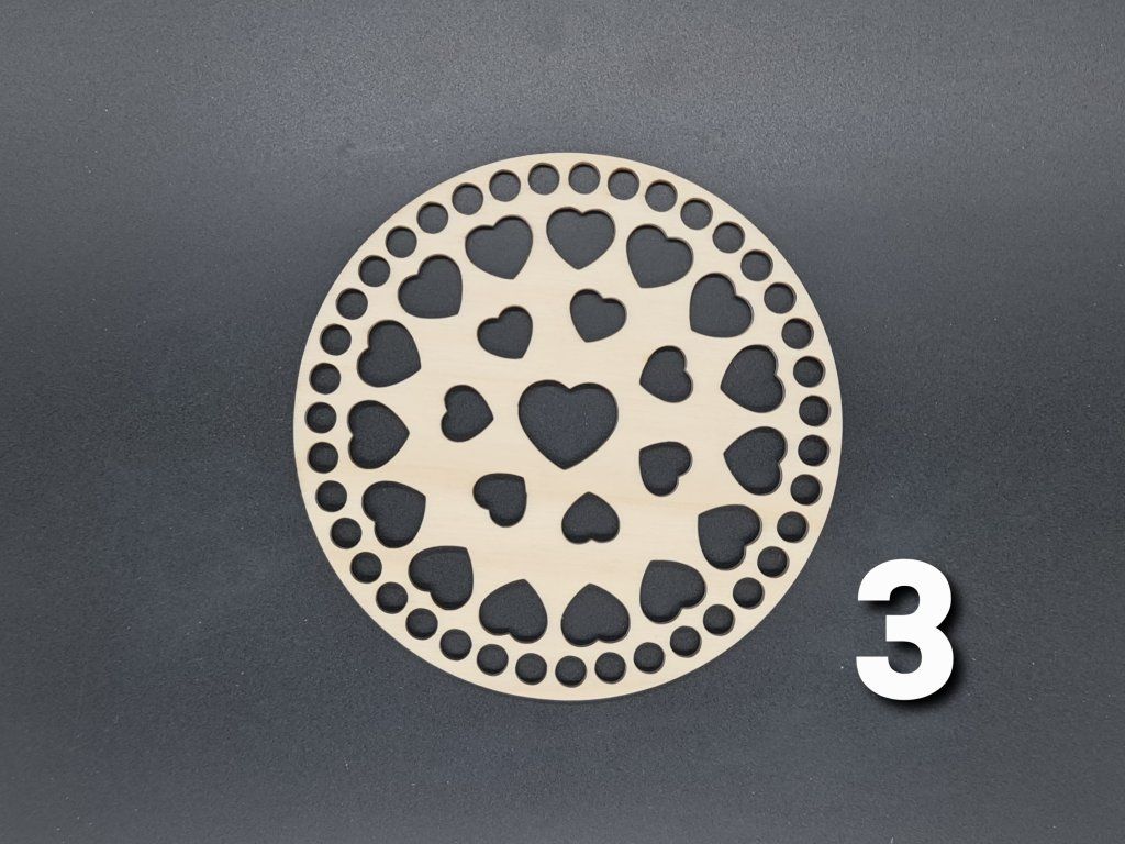 Kruhové víko z topolové překližky o síle 4mm. Průměr otvorů cca 9mm odsazení od kraje 3-4mm rozměr mezi otvory 3-4mm.